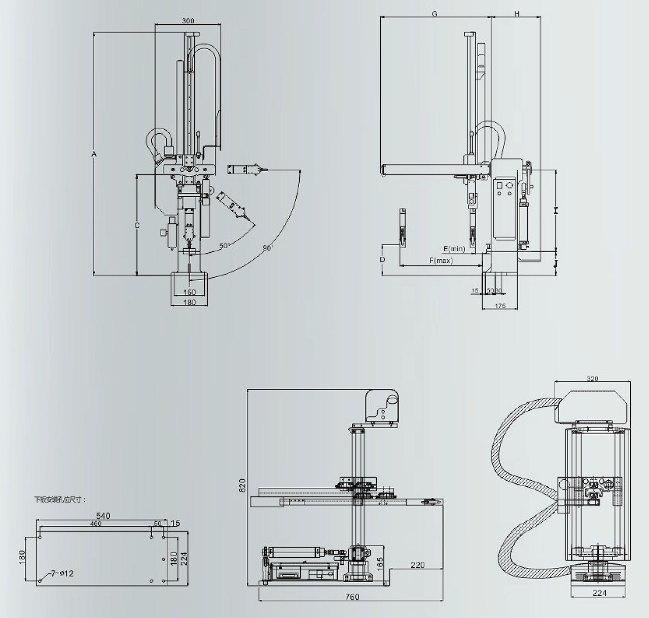 S-series旋臂式機械手臂系列主要適用於50-200噸臥式射出成型機的水口取出,手臂有單截式和雙截式的兩種,整機旋出入,引拔,上下均全氣壓驅動,全功能機器附有真空發生器及標準吸治具,單功能則無。